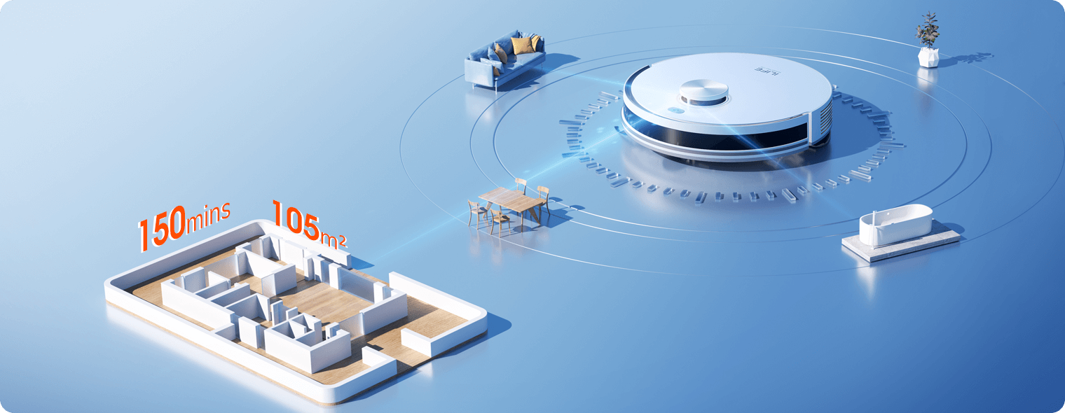 The high-capacity battery supports up to 150 minutes of operation, maintaining steady power as the robot moves through multiple rooms before returning to recharge.