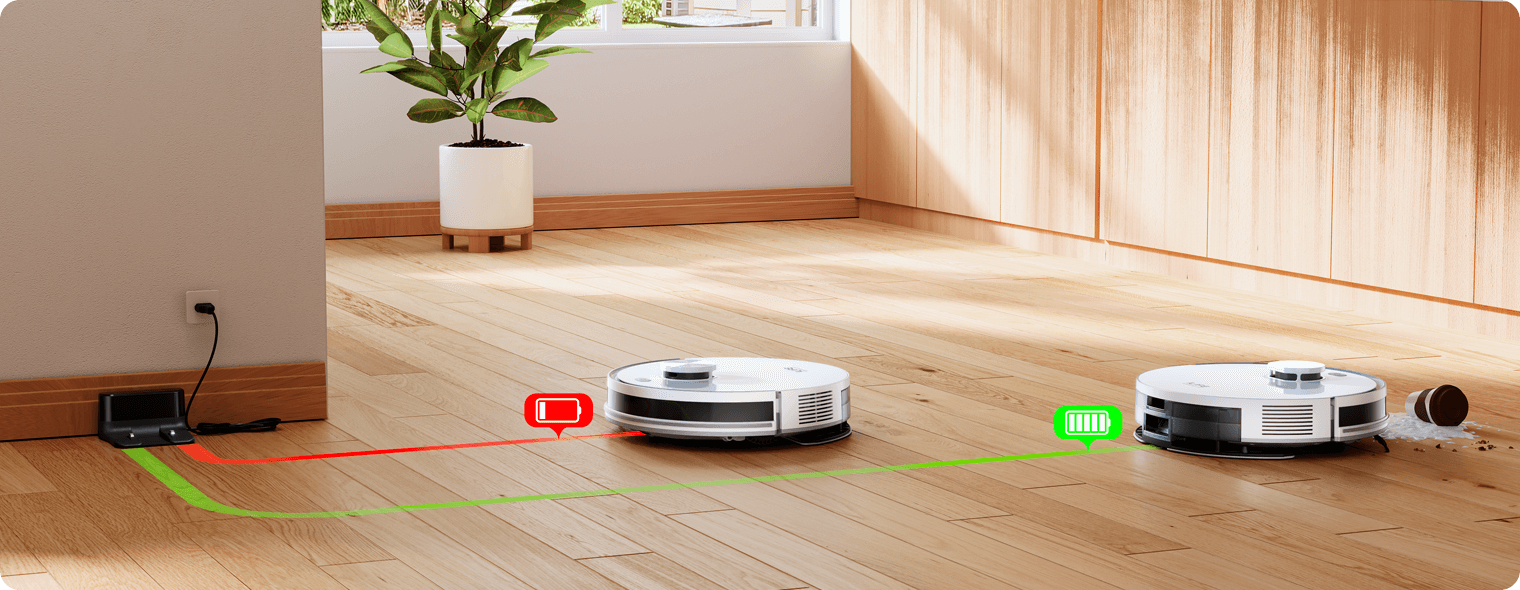 When the battery runs low, the robot returns to the dock to recharge and then resumes cleaning from the point it paused, helping ensure the task is completed efficiently.