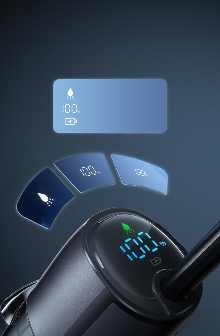 Stay updated in real time with a clear LED display that shows battery level, water spray status, fault alerts, and charging status — all in one place.
